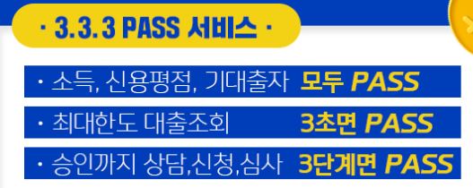 3.3.3 PASS 서비스 소득, 신용평점, 기대출자 모두 PASS · 최대한도 대출조회 3초면 PASS ·승인까지 상담,신청,심사 3단계면 PASS|